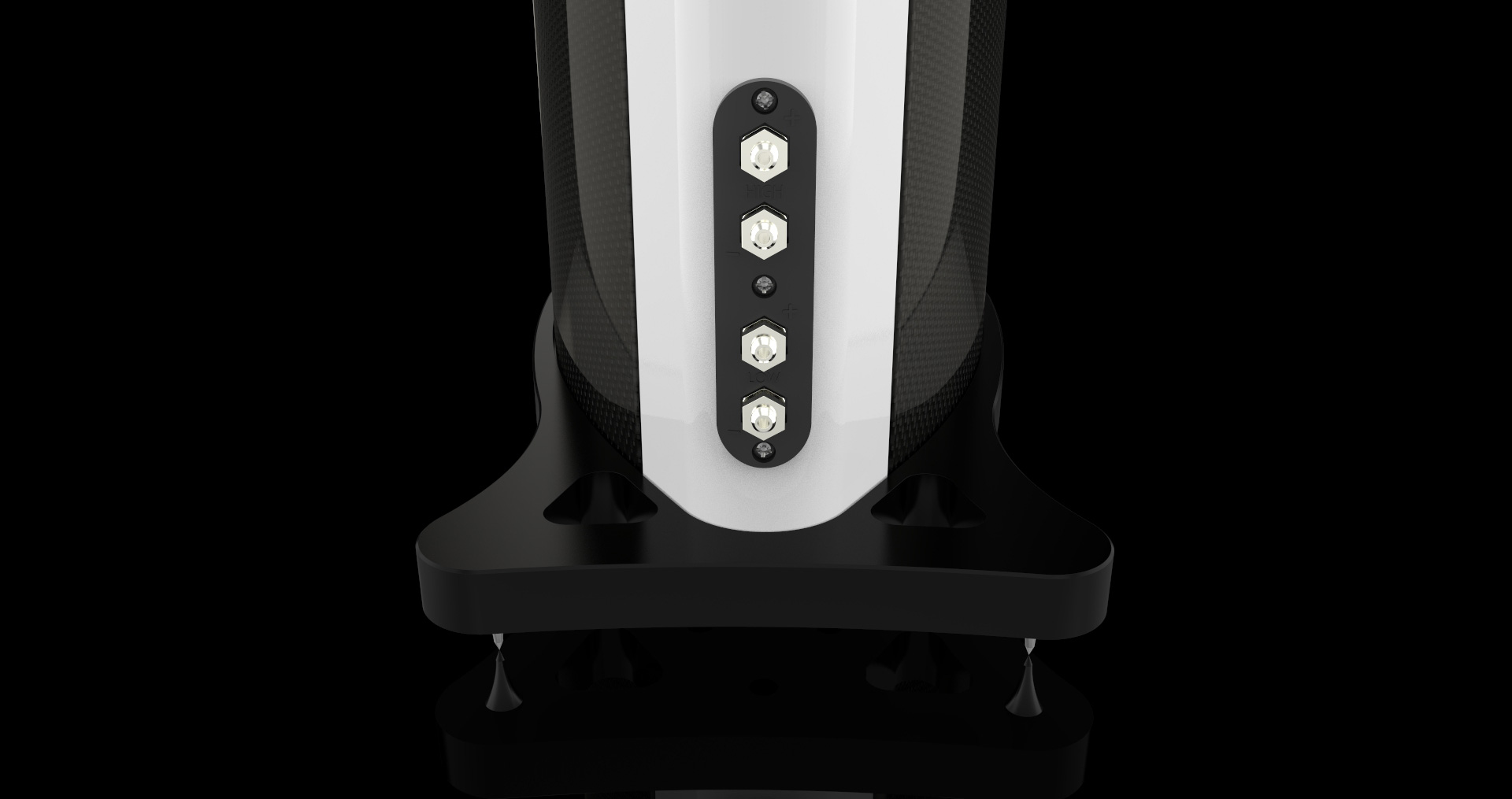 | FINISHES | Anodised black baffle Silk black spine and foot High gloss satin weave carbon fibre cabinet High gloss black acrylic top Bespoke side cheek options |